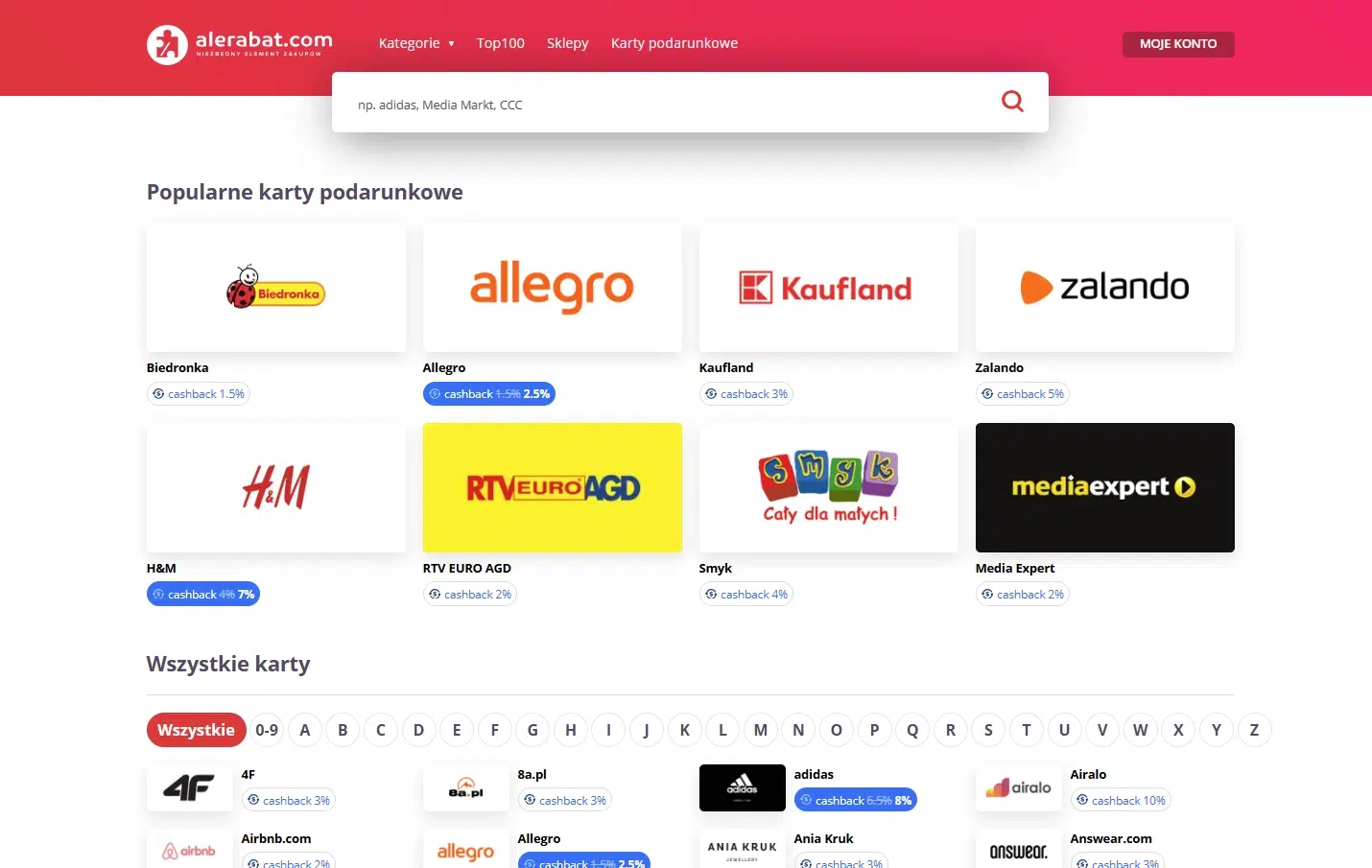 Wśród objętych promocją marek znajdują się m.in. Allegro, Ikea, Empik, Rainbow, Adidas, H&M, Sinsay, HalfPrice oraz Zalando. Pełną listę znajdziesz na stronie AleRabat.com w sekcji kart podarunkowych.