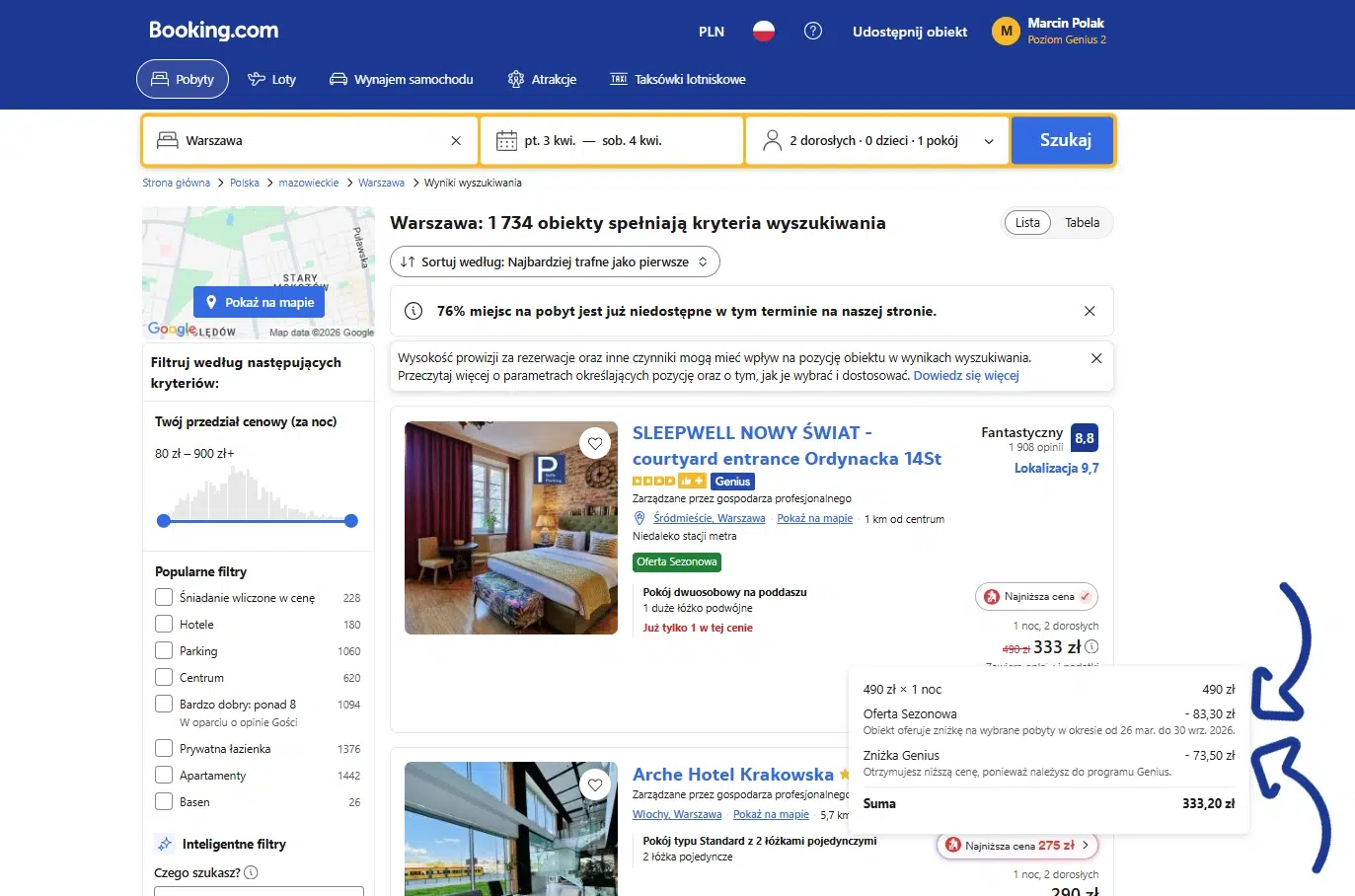 Zaloguj się na swoje konto Booking przed wyszukiwaniem noclegów. Dzięki temu system od razu pokaże Ci zniżki Genius i oferty sezonowe, które możesz połączyć. A jeśli jeszcze nie masz konta – rejestracja trwa minutę i naprawdę się opłaca.