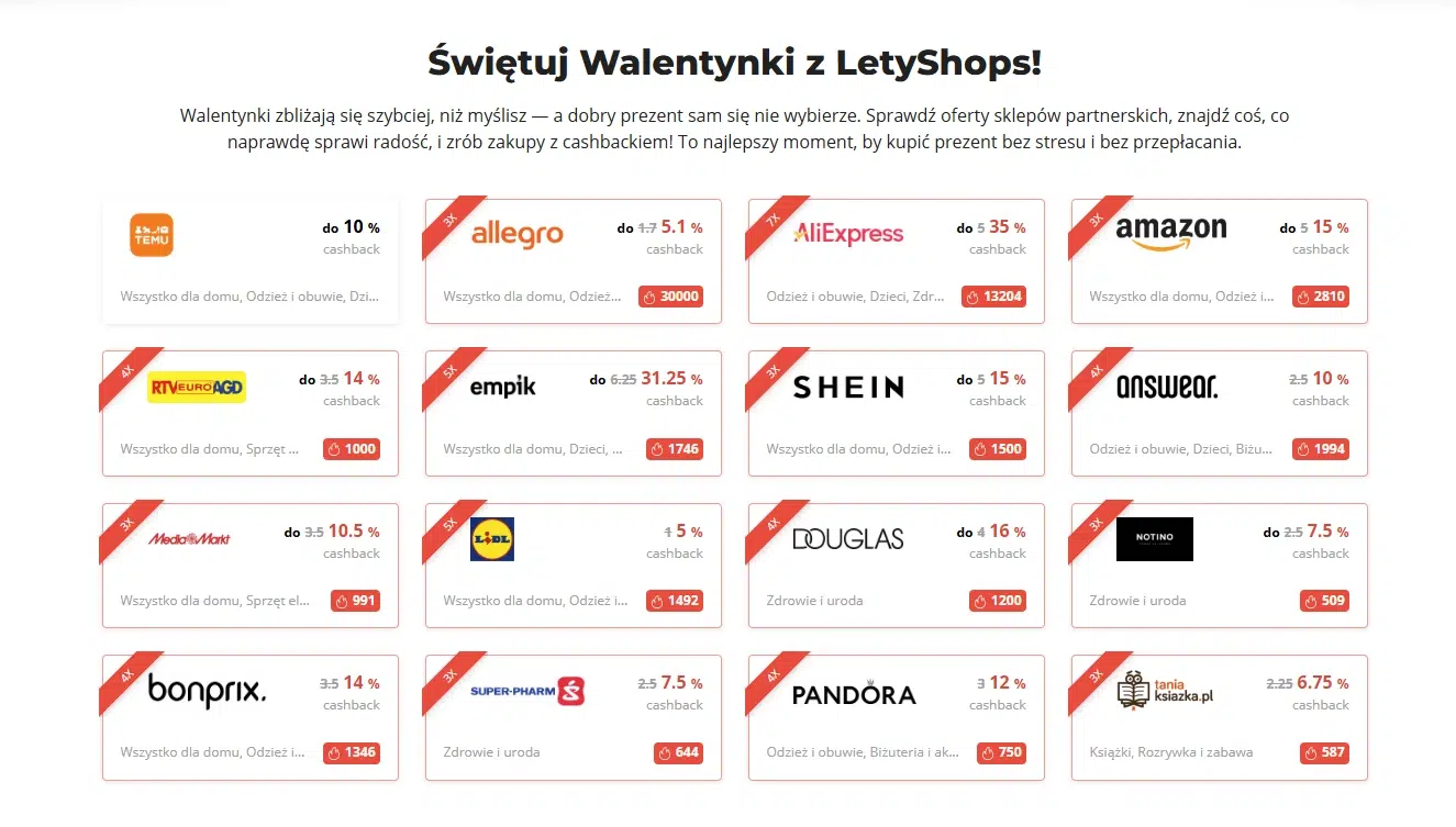 Wszystkie dostępne oferty znajdziesz pod tym adresem: 🔗 https://letyshops.com/pl/promotions/walentynki2026