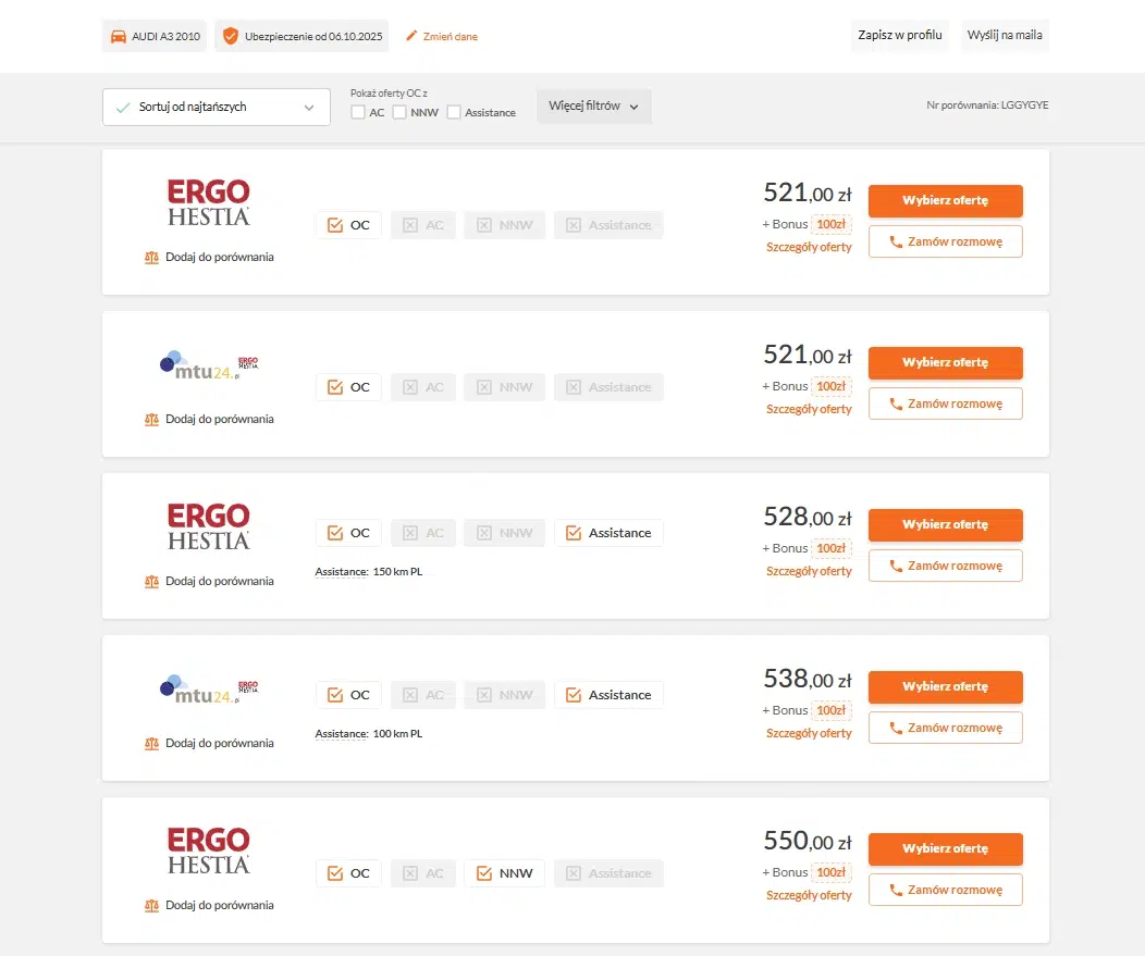 📌 Poniżej znajdziesz moją przykładową kalkulację dla Audi A3 z 2010 r. – kilkadziesiąt różnych ofert i wszędzie ten sam bonus 100 zł w gotówce. Najtańsza oferta OC wynosiła 483,69 zł (LINK4), a najdroższa 733 zł (Balcia) – całkiem spora różnica w cenie…
