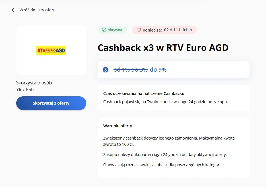 W ramach aktualnej oferty specjalnej możesz odebrać trzykrotnie wyższy cashback za zakupy w sklepie RTV Euro AGD. To dobra okazja, jeśli planujesz zakup sprzętu elektronicznego lub AGD i chcesz odzyskać więcej pieniędzy niż standardowo.