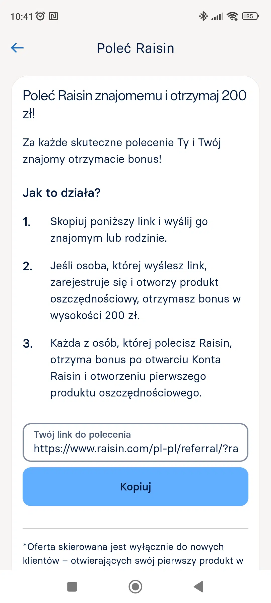 Program poleceń Raisin to promocja w której zarówno osoba polecająca, jak i zaproszona mogą otrzymać 200 zł premii. Aby skorzystać z oferty wystarczy, że polecający udostępni swój indywidualny link znajomym lub rodzinie.